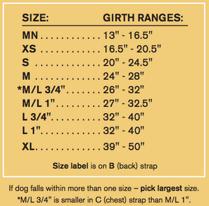| Med / Large (3/4″ webbing) | 26 – 32″ girth | 40 – 75 lbs |