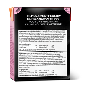 De-Boned Alaskan Pollock, Turkey, Salmon Broth, Turkey Broth, Tapioca, Brown Rice, Sunflower Oil, Dried Egg Whites, Carrots, Peas, Sweet Potatoes, Potatoes, Oats, Flaxseed, Pumpkin, Cassia Gum, Tricalcium Phosphate, Guar Gum, Potassium Chloride, Sodium Tripolyphosphate, Choline Chloride, Vitamins (Vitamin A Supplement, Vitamin D3 Supplement, Vitamin E Supplement, Niacin, D-Calcium Pantothenate, Thiamine Mononitrate, Riboflavin, Pyridoxine Hydrochloride, Folic Acid, Biotin, Vitamin B12 Supplement), Minerals (Zinc Proteinate, Iron Proteinate, Copper Proteinate, Manganese Proteinate, Calcium Iodate, Selenium Yeast), Taurine, Salt, Magnesium Sulphate.