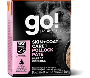 GO! SOLUTIONS Skin & Coat wet food is great for dogs with skin issues, but all dogs can enjoy this delicious recipe. Made using MSC-Certified salmon from Alaska this recipe combats dandruff and itchy skin with the Omega-3 fatty acids from the salmon, as well as from sunflower seeds and flaxseeds. Skin & Coat Pollock is a 100% chicken free recipe and contains no artificial preservatives or by-product meals.