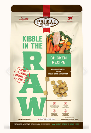 Upgrade your pup's kibble to the Kibble in the Raw from Primal! Able to be fed easily like kibble but with all the benefits of a freeze-dried raw diet. This grain-inclusive food is nutrient dense with freeze-dried raw protein and air-dried produce combined into a tasty freeze-dried bite! This recipe features cage-free chicken and organic fruits and veggies like apples, sweet potato and kale.