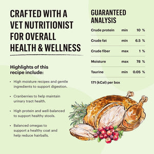 Chicken, chicken broth, chicken liver, pumpkin, carrots, blueberries, cranberries, natural chicken flavor, calcium carbonate, agar agar, dandelion greens, potassium chloride, choline chloride, vitamins [vitamin E supplement, vitamin A supplement, niacin supplement, calcium pantothenate (vitamin B5), thiamine mononitrate (vitamin B1), riboflavin (vitamin B2), pyridoxine hydrochloride (vitamin B6), folic acid, biotin (vitamin B7), vitamin B12 supplement, vitamin D3 supplement], magnesium proteinate, taurine, minerals [copper proteinate, iron proteinate, manganese proteinate, potassium iodide, zinc proteinate, sodium selenite], kelp, yucca schidigera extract, salmon oil.