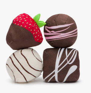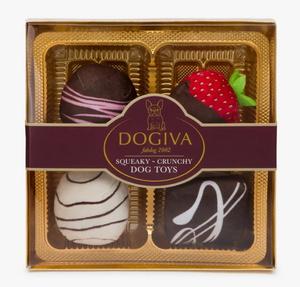 Treat your pup this Valentine's Day with the Dogiva Box of Chocolates from Fabdog! Packaged in a real chocolate box, this authentic toy contains 4 different chocolate inspired toys and features super squeaky squeakers and crunchy texture for tons of fun! Great for chewing and fetching.