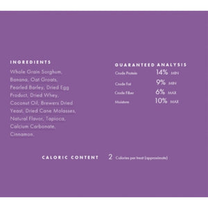 Whole Grain Sorghum, Banana, Oat Groats, Pearled Barley, Dried Egg Product, Dried Whey, Coconut Oil, Brewers Dried Yeast, Dried Cane Molasses, Natural Flavour, Tapioca, Calcium Carbonate, Cinnamon.