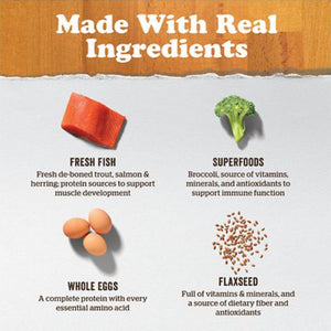 De-boned trout, whole dried egg, potatoes, potato flour, peas, pea flour, apples, flaxseed, canola oil (preserved with mixed tocopherols), natural flavour, de-boned salmon, de-boned herring, coconut oil (preserved with mixed tocopherols), tomato, alfalfa, carrots, pumpkin, sweet potatoes, squash, bananas, blueberries, cranberries, blackberries, pomegranate, papayas, lentils, broccoli, dried chicory root, dried rosemary.