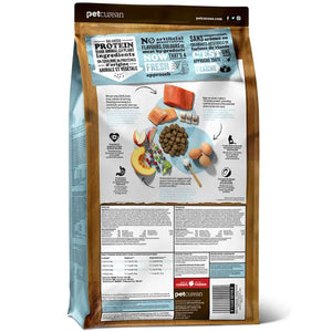 De-boned trout, whole dried egg, potatoes, potato flour, peas, pea flour, natural flavour, canola oil (preserved with mixed tocopherols), flaxseed, coconut oil (preserved with mixed tocopherols), de-boned salmon, de-boned herring, calcium carbonate, tomato, alfalfa, apples, carrots, sweet potatoes, squash, pumpkin, bananas, blueberries, cranberries, blackberries, pomegranate, papayas, lentils, broccoli, dried chicory root, phosphoric acid, sodium chloride, potassium chloride, choline chloride, vitamins (vitamin A supplement, vitamin D3 supplement, vitamin E supplement, niacin, L-ascorbyl-2-polyphosphate (a source of vitamin C), thiamine mononitrate, d-calcium pantothenate, riboflavin, pyridoxine hydrochloride, beta-carotene, folic acid, biotin, vitamin B12 supplement), minerals (zinc proteinate, iron proteinate, copper proteinate, zinc oxide, manganese proteinate, copper sulphate, calcium iodate, ferrous sulphate, manganous oxide, sodium selenite), taurine, DL-methionine, L-lysine, dried Lactobacillus acidophilus fermentation product, dried Enterococcus faecium fermentation product, L-carnitine