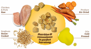 Chicken (with ground bone), Chicken Liver, Sorghum, Pork (with ground bone), Pork Plasma, Egg, Salmon Oil, Organic Carrot, Organic Kale, Organic Apple, Organic Sweet Potato, Chicken Fat, Dried Yeast, Sea Salt, Montmorillonite Clay, Miscanthus Grass, Organic Coconut, Vitamin E Supplement, Vegetable Oil, Cod Liver Oil, Organic Ground Alfalfa, Inulin, Dried Organic Kelp, Liquid Lactobacillus acidophilus fermentation product, Liquid Lactobacillus casei fermentation product, Liquid Lactobacillus reuteri fermentation product, Liquid Bifidobacterium animalis fermentation product, Mixed Tocopherols (Preservative), Taurine, Green Tea Extract, Rosemary Extract.